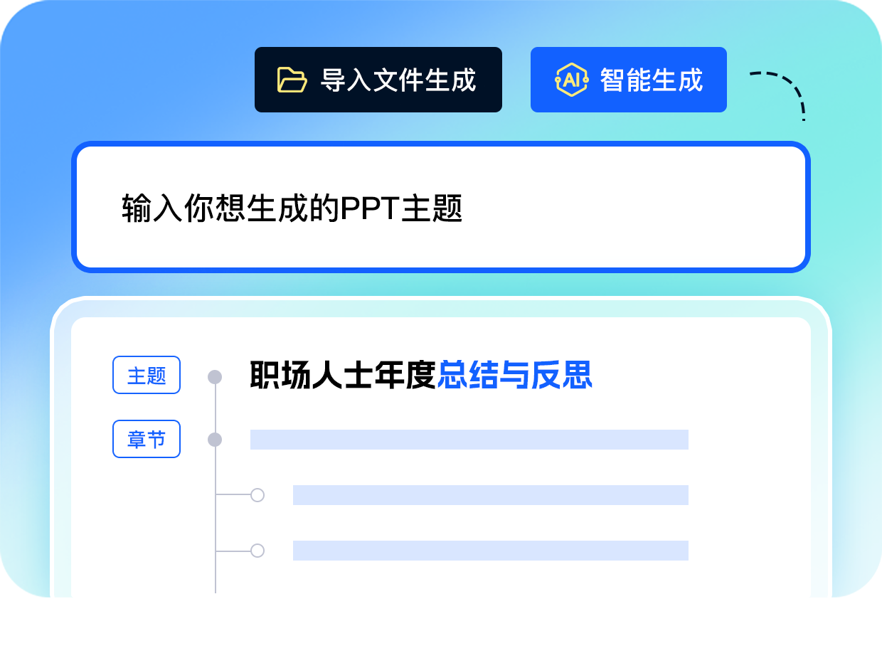 输入主题,PPT一键自动生成。根据你的语义AI自动解析生成完整的PPT文档,支持个性化生成和编辑诉求,PPT制作本就如此简单。